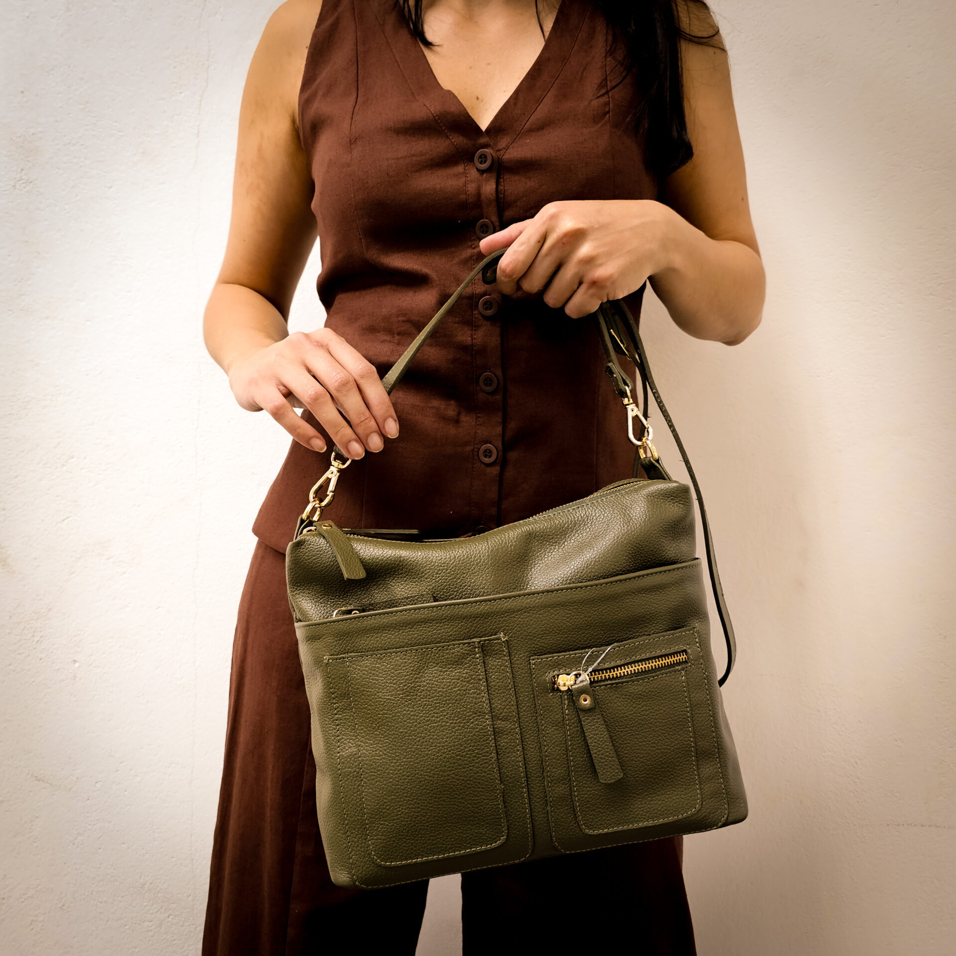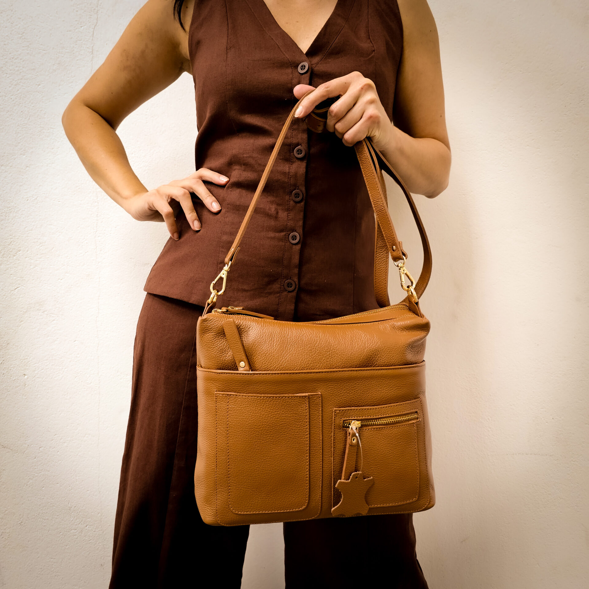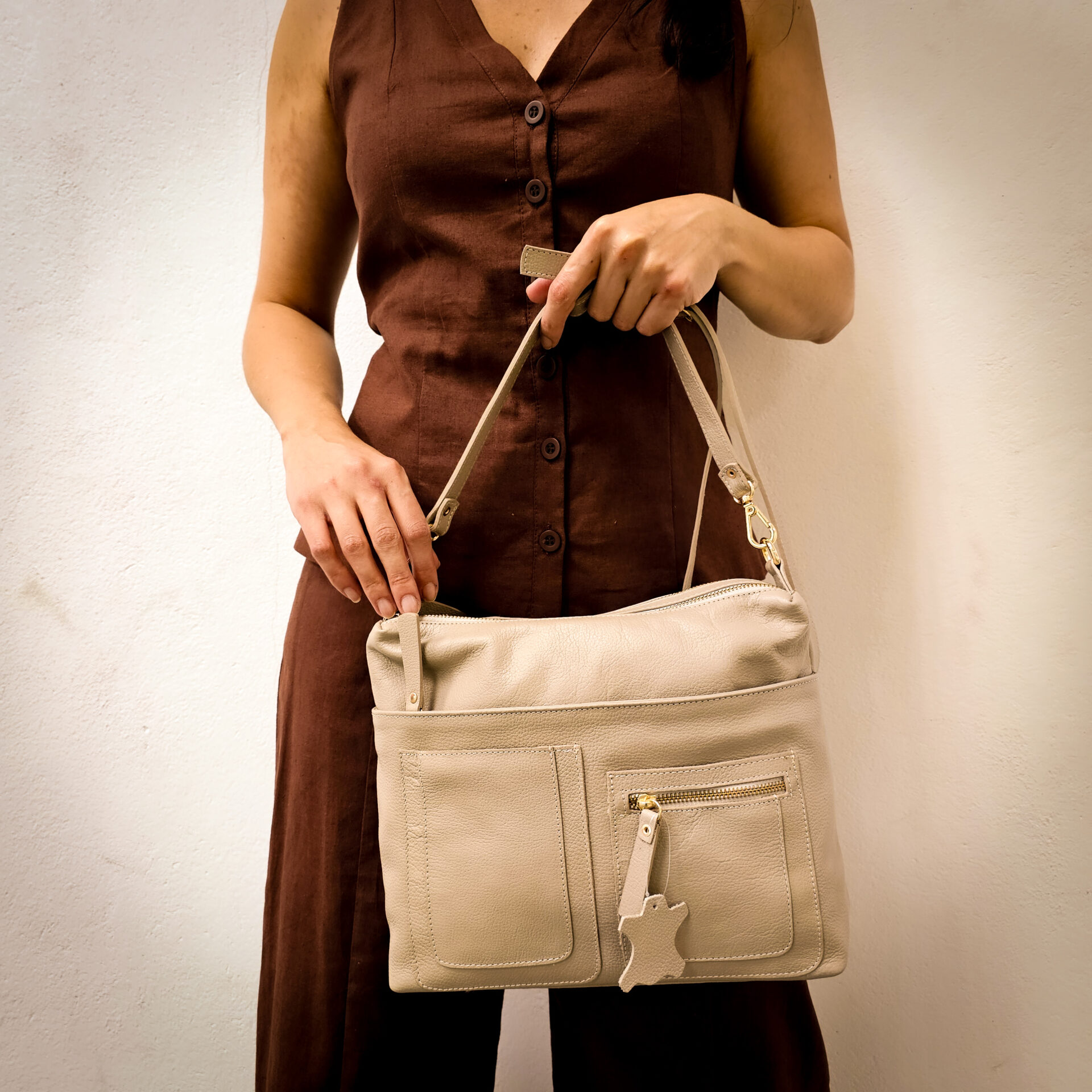Bolsa feminina em couro legítimo com textura natural e toque macio. seu modelo por ser despojado, espaçoso e cheio de bolsos e charme vai ser perfeito para passeios e ate mesmo para trabalho.